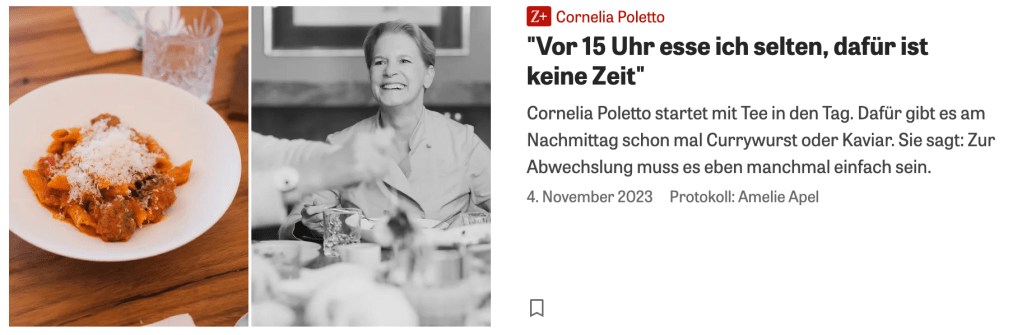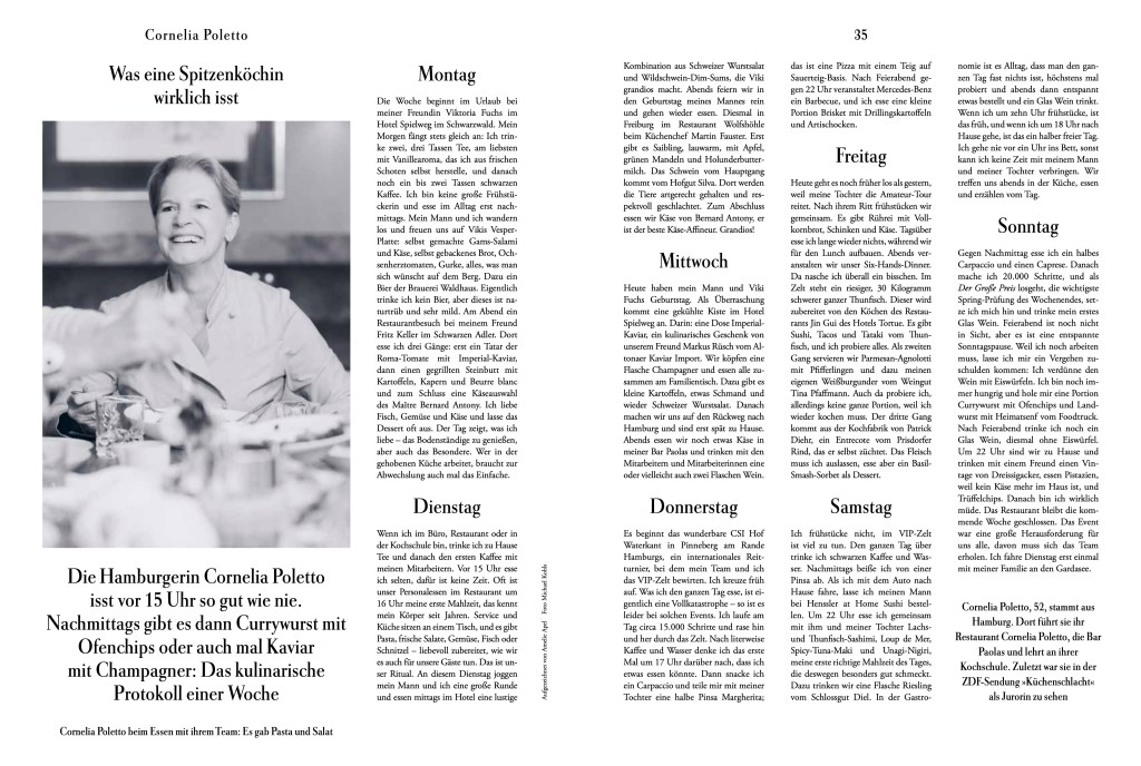 Die Hamburgerin Cornelia Poletto isst vor 15 Uhr so gut wie nie. Nachmittags gibt es dann Currywurst mit Ofenchips oder auch mal Kaviar mit Champagner: das kulinarische Protokoll einer Woche.