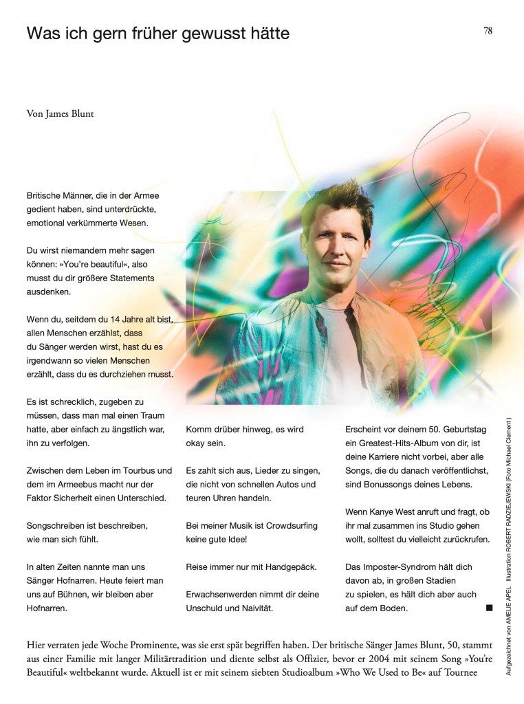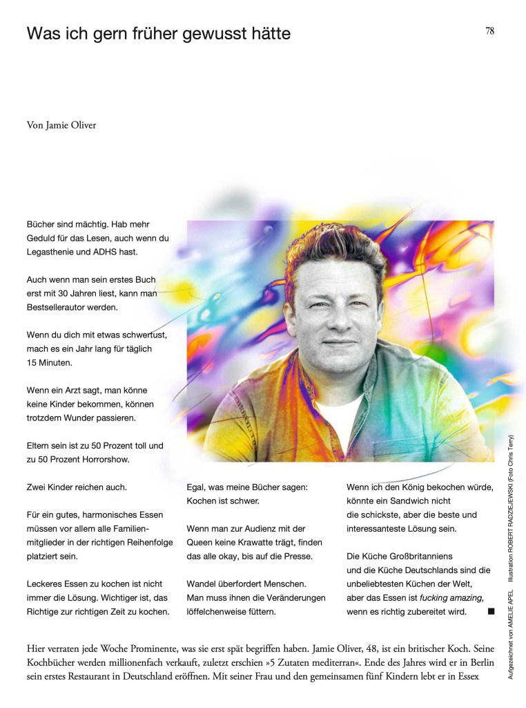 In der ZEITmagazin-Serie „Was ich gern früher gewusst hätte“ verraten jede Woche Prominente, was sie erst spät begriffen haben. Amelie Apel interviewte dafür Jamie Oliver, Dolly Alderton, James Blunt, Caroline O’Donoghue und Isabell Werth.