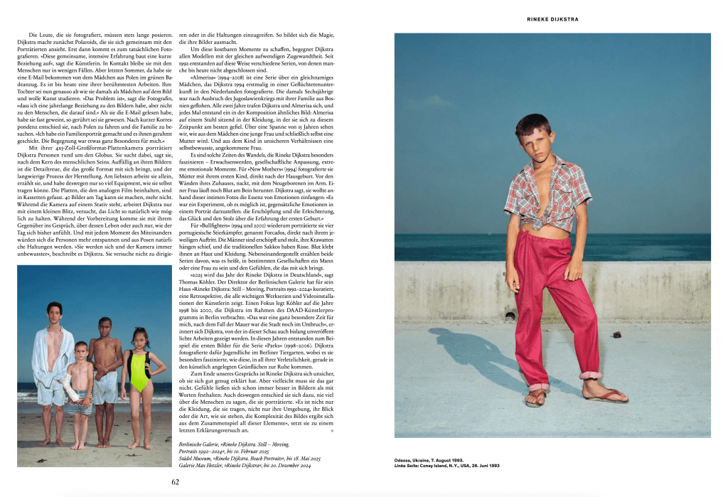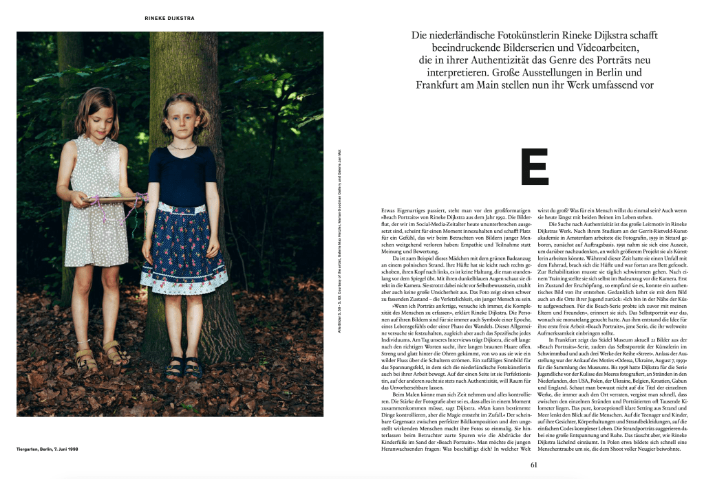 Die niederländische Fotokünstlerin Rineke Dijkstra schafft beeindruckende Bilderserien und Videoarbeiten, die in ihrer Authentizität das Genre des Porträts neu interpretieren. Große Ausstellungen in Berlin und Frankfurt am Main stellen nun ihr Werk umfassend vor.